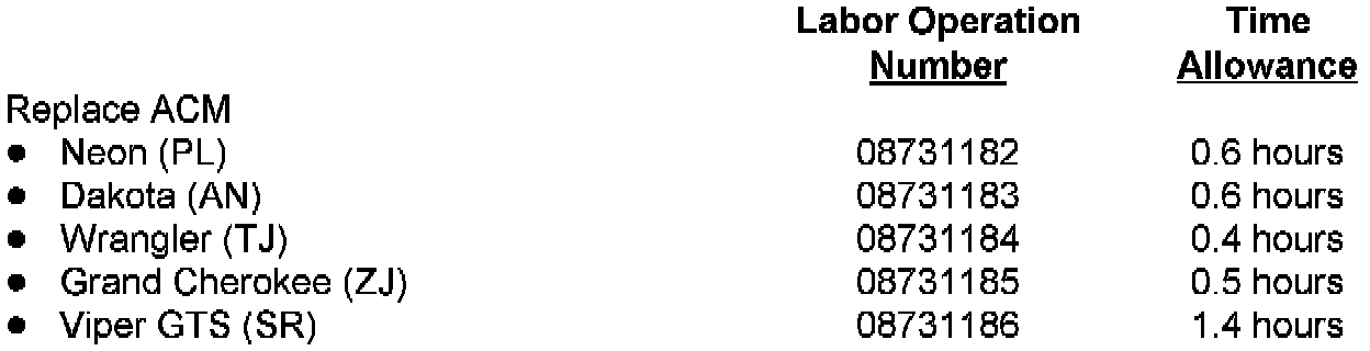 Claims for vehicles which have been serviced must be submitted on the DIAL System. Claims submitted will be used by Chrysler to record recall service completions and provide dealer payments.Use one of the labor operation numbers and time allowances as shown.
