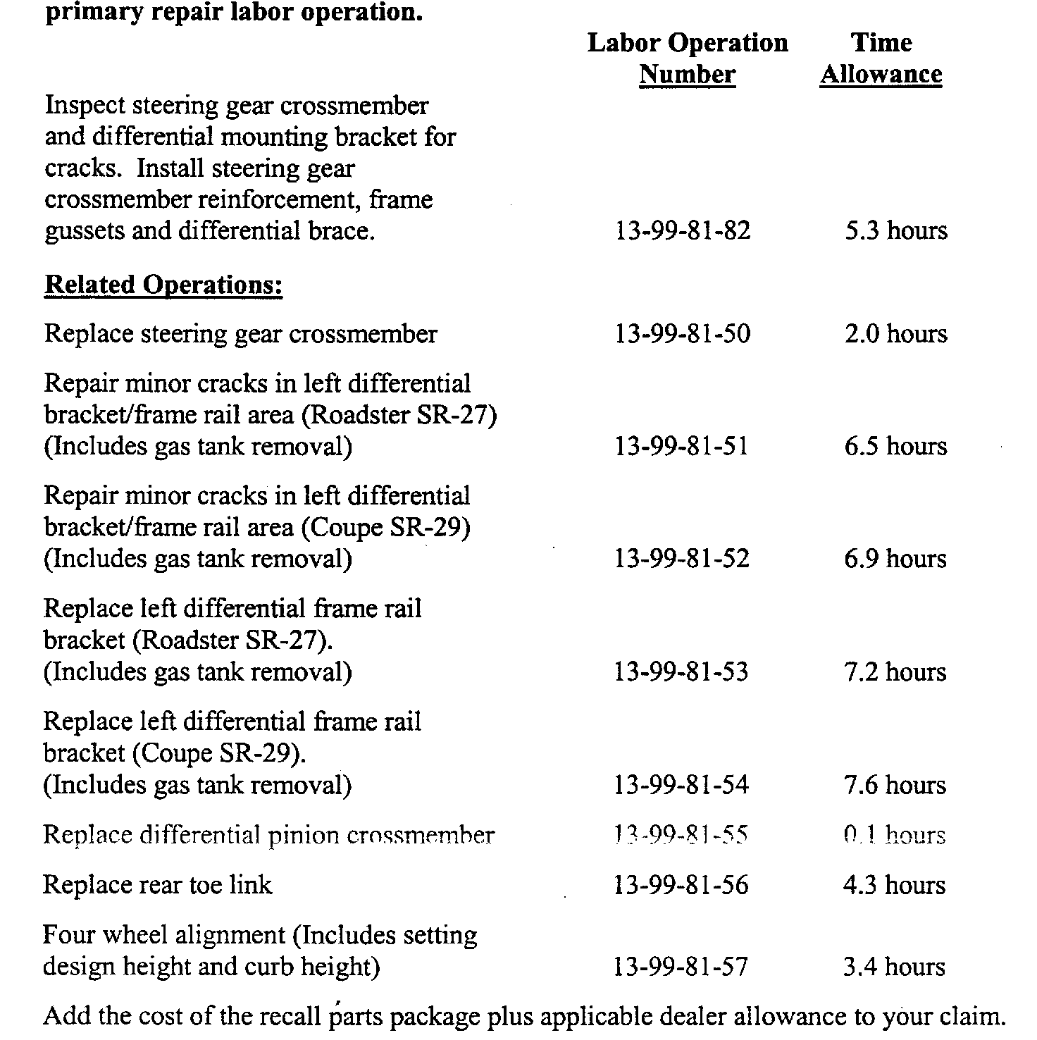 Use the labor operation number and any appropriate related operations as necessary. Related operations must be included in the same condition as the primary repair labor operation.
