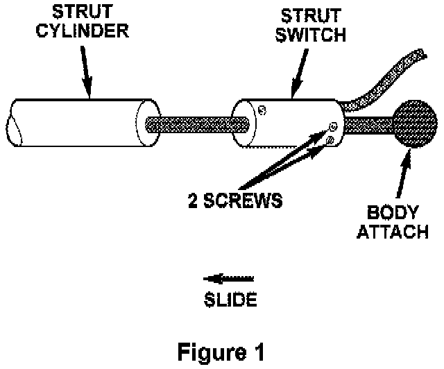 1. Open the rear hatch.2. Loosen the two strut switch screws nearest the strut attachment to the body. Figure 1.