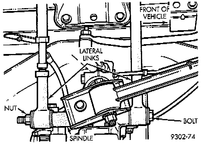 4. Remove the nut and bolt on each side of vehicle attaching the lateral links to the spindle.