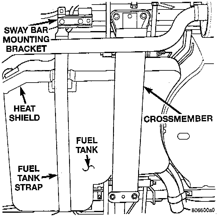 3. Position a transmission jack under the fuel tank just forward of the crossmember to help support fuel tank when crossmember is removed.