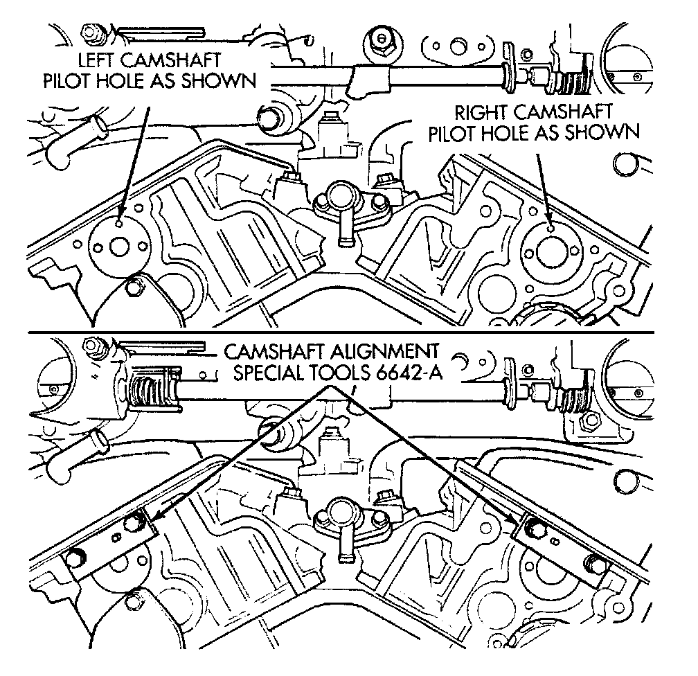 4. Install the camshaft alignment Special Tools 6642, or equivalent to the rear of each cylinder head.