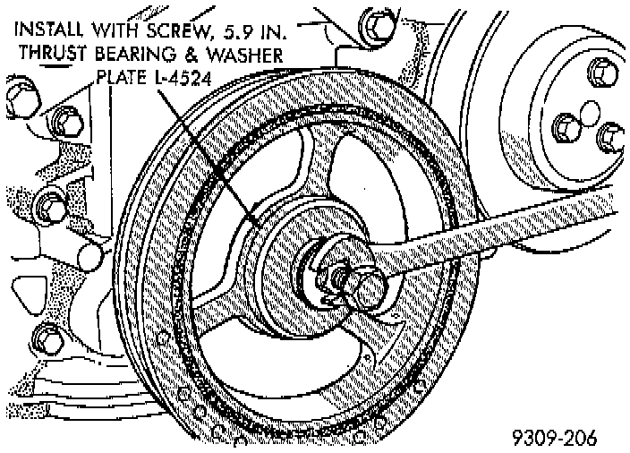 6. Install camshaft sprockets onto the camshafts. Install NEW sprocket attaching bolts into place. The 255 mm (10 inch) bolt is to be installed in the left camshaft and the 213 mm (8 3/8 inch) bolt is to be installed into the right camshaft. Do not tighten the bolts. Camshaft sprocket mark should be positioned between the marks on the cover at both sprockets.