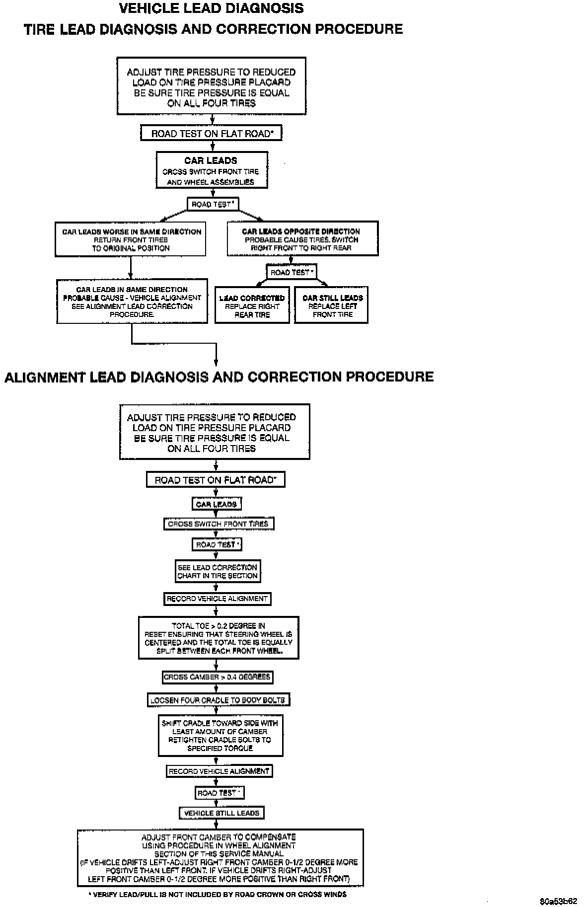 Use the chart in the illustration to diagnose a vehicle that has a complaint of a drift or lead condition. The use of the chart will held to determine if the lead condition is the result of a bad tire or is caused by the front wheel alignment.