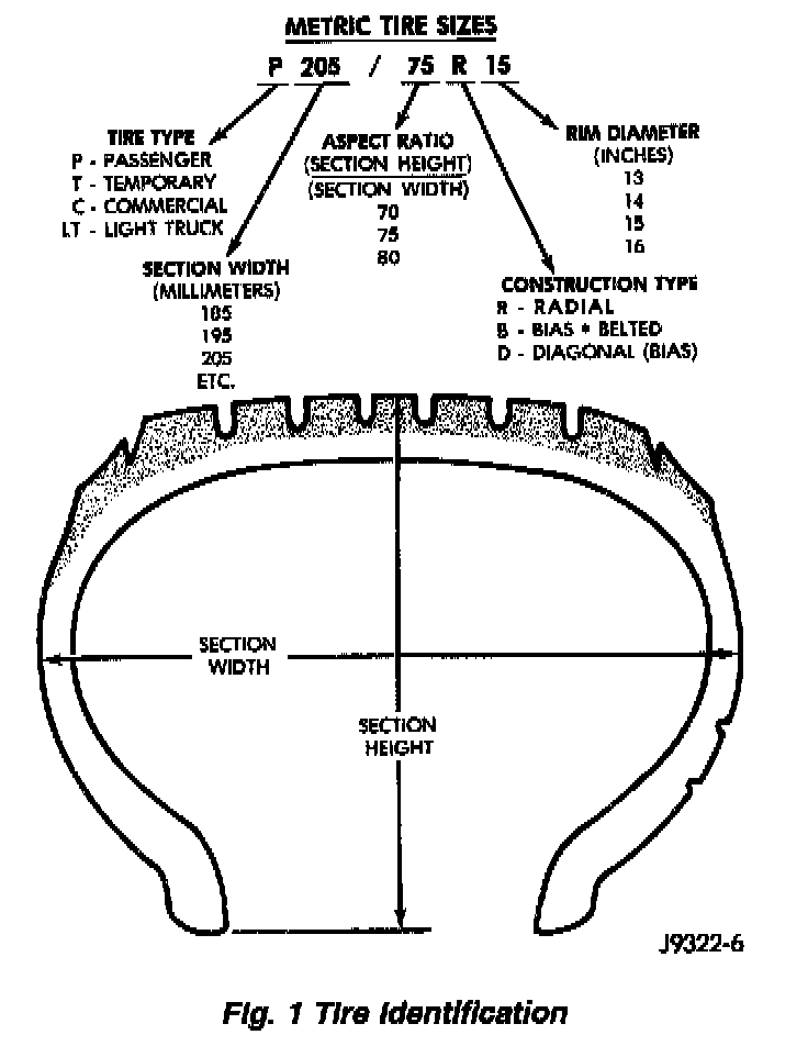 Tire type, size, aspect ratio and speed rating are encoded in the letters and numbers imprinted on the side wall of the tire. Refer to the illustration to decipher the tire identification code.