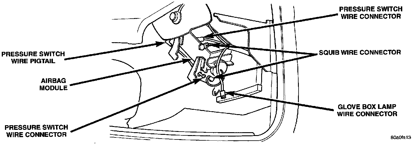 5. Disconnect the pressure switch and the squib wire connectors from module.