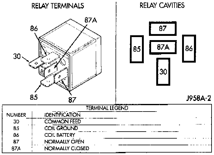 1. A relay in the de-energized position should have continuity between terminals 87A and 30, and no continuity between terminals 87 and 30. If OK, go to Step 2. If not OK, replace the faulty relay