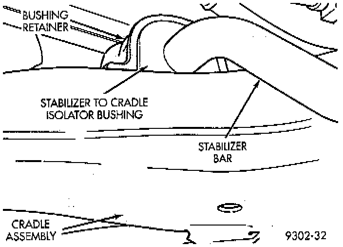 3. Inspect for broken or distorted retainers and bushings. If bushing replacement is required, bushing can be removed by opening slit in bushing and removing bushing from around stabilizer bar. The stabilizer bar to cradle assembly bushings, should be positioned on stabilizer bar, so slit in bushing is positioned toward front of vehicle.