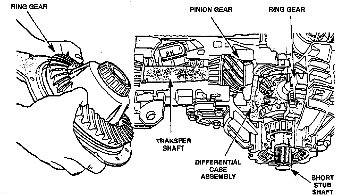 The 42LE uses a hypoid type ring and pinion gear set. The ring gear is bolted to the differential case, and drives the differential case in all gear ranges. The differential case assembly consists of the differential case and within it, two pinion gears, two side gears and a pinion mate shaft retained with a roll pin. The differential case provides input power from the ring gear to the axle shafts through the case, pinion shaft, pinion gears and side gears. The pinion and side gears allow the right and left axles to rotate at different speeds while the vehicle is cornering.