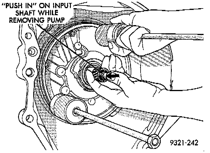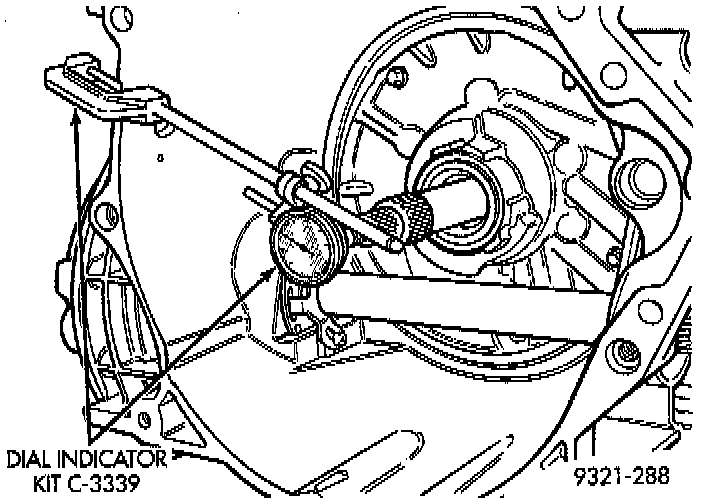 As a final check of the transaxle, measure the input shaft end play. This will indicate when a #4 thrust plate change is required. The number 4 thrust plate is located behind the overdrive clutch hub. Attach a dial indicator to transaxle bell housing with its plunger seated against end of input shaft. Move input shaft in and out to obtain end play reading. End play specifications are 0.13 to 0.64 mm (0.005 to 0.025 inch). If not within specifications, make the necessary thrust plate adjustment.