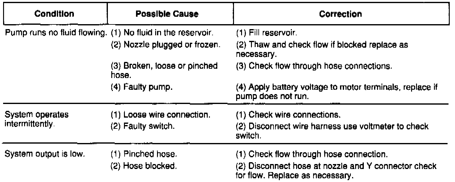 The following is a list of general wiper motor system problems and tests that are to be performed to locate the faulty part, and the corrective action to be taken. These tests will cover both two speed and intermittent wiper functions.