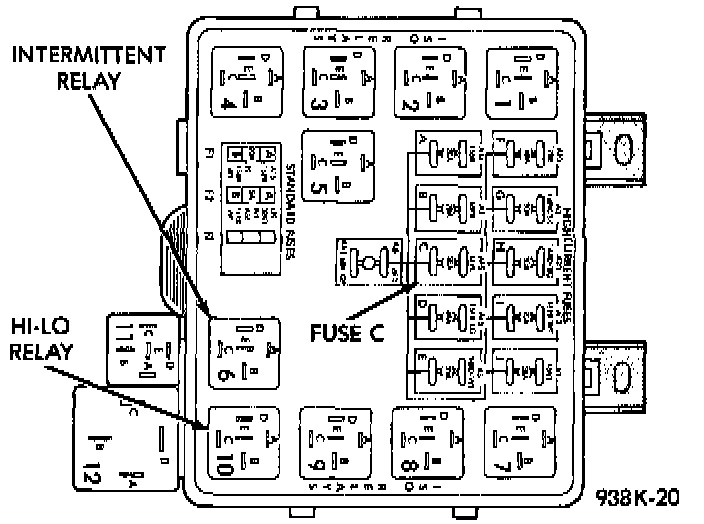 5. The wiper switch in the ON position. Using an voltmeter, check for battery voltage at terminal D of the intermittent wiper relay in the Power Distribution Center. If no voltage check fuse C. If OK, go to Step 6. If not OK, repair as necessary.