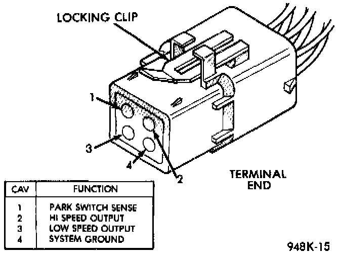 4. Using an ohmmeter, check for good ground at Pin 4 of the wiper motor wire harness connector. If OK, replace motor. If not repair the ground circuit as necessary.