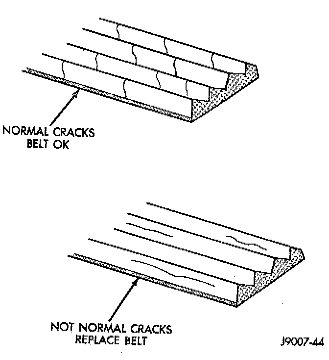 Belt replacement under any or all of the following conditions is required, excessive wear, frayed cords or severe glazing. Poly-V-Belt system with back drive pulley may develop minor cracks across the ribbed side (due to reverse bending). These minor cracks are considered normal and acceptable. Cracks parallel are not.