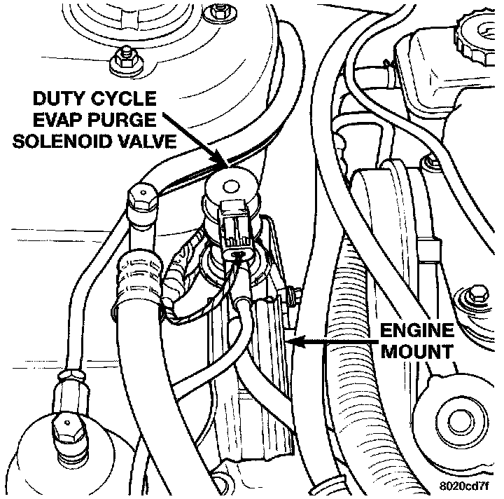 The duty cycle EVAP purge solenoid regulates the rate of vapor flow from the EVAP canister to the throttle body. The powertrain control module operates the solenoid.