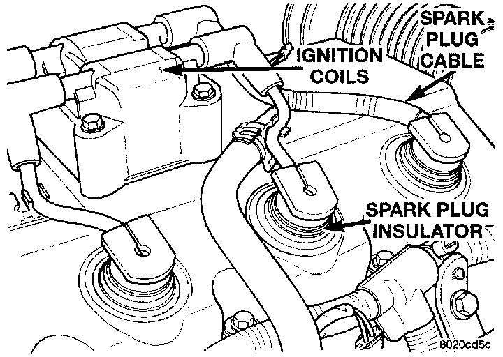The coil assembly consists of 2 coils molded together. The coil assembly is mounted over the valve cover (Fig. 28). High tension leads route to each cylinder from the coil. The coil fires two spark plugs every power stroke. One plug is the cylinder under compression, the other cylinder fires on the exhaust stroke. Coil number one fires cylinders 1 and 4. Coil number two fires cylinders 2 and 3. The PCM determines which of the coils to charge and fire at the correct time.