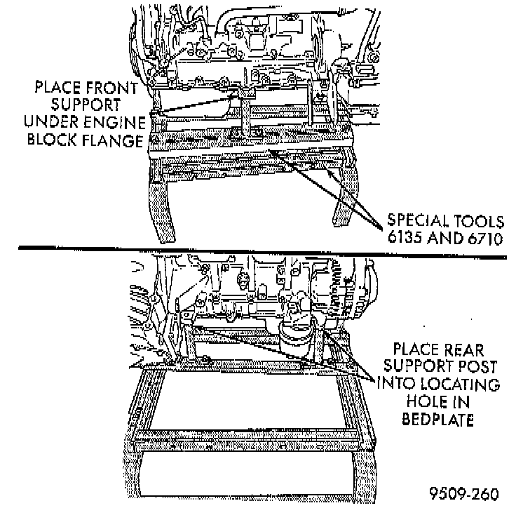 22. Raise vehicle enough to allow engine dolly and cradle Special Tools 6135 and 6710, or equivalents to be installed under vehicle.