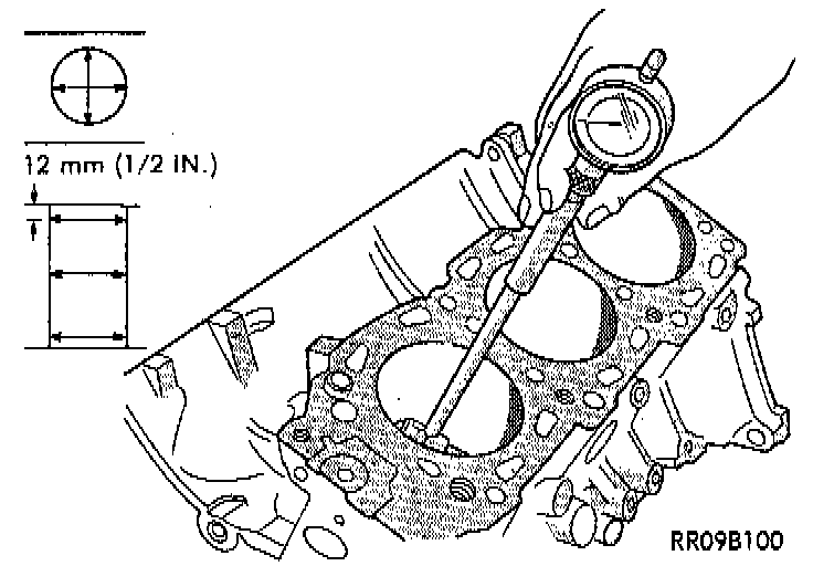Examine cylinder walls for scuffs, scoring and measure cylinder bore for out-of-round or taper. If defective, bore cylinder to oversize. Measure at points shown.
