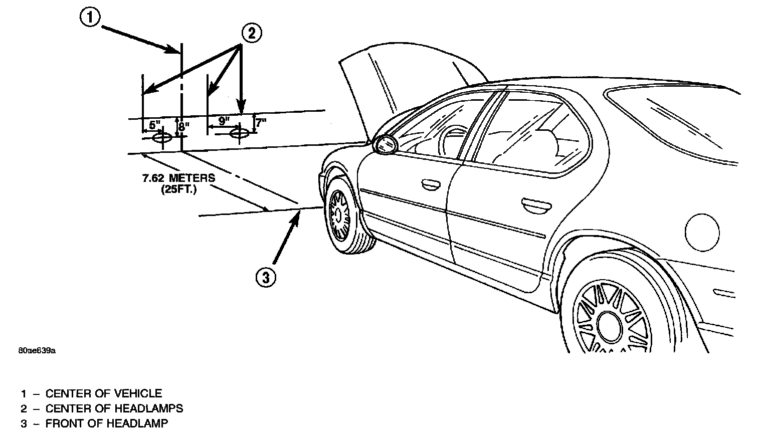 1. Position vehicle on a level surface perpendicular to a flat wall 7.62 meters (25 ft) away from front of headlamp lens.