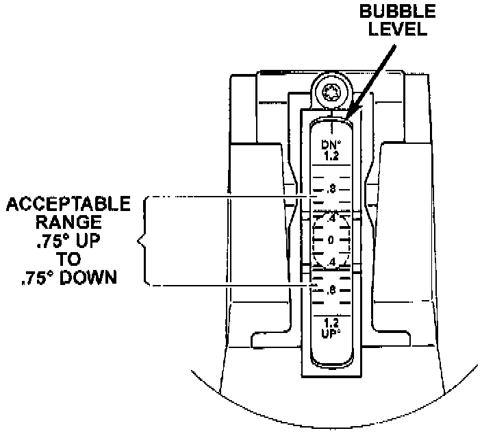 A properly aimed left low beam headlamp will project the center of the low beam hot spot on the alignment screen 8 in. (203 mm) below the horizontal centerline and 5 in. (127 mm) right of headlamp centerline. A properly aimed right low beam headlamp will project the center of the low beam hot spot on the alignment screen 7 in. (178 mm) below the horizontal centerline and 9 in. (229 mm) right of headlamp center line. The preferred headlamp alignment is 0 (± 0.76 °) for the up/down adjustment as indicated on bubble level. Preferred left/right alignment is 0 (± 0.76 °) as indicated on the gauge wheel. The high beam headlamps cannot be aligned. The high beam pattern should be correct when the low beams are aligned properly