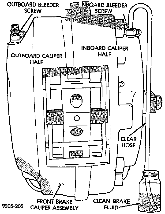 6. Repeat steps 2 and 3 above on outboard half of the caliper assembly. Then close the bleeder screw on the outboard caliper.