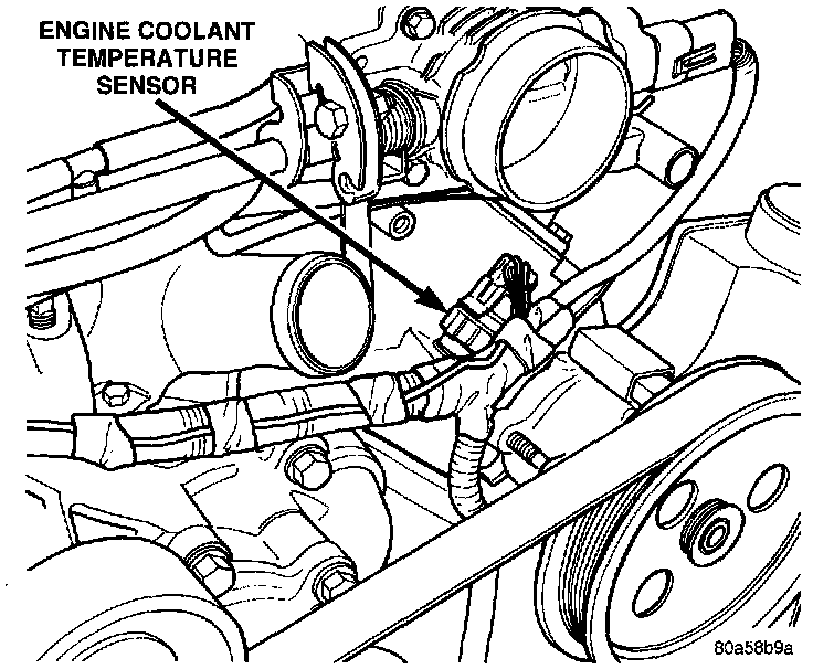 The engine coolant temperature sensor threads into the cylinder head behind the Power Steering Pump (Fig. 11).