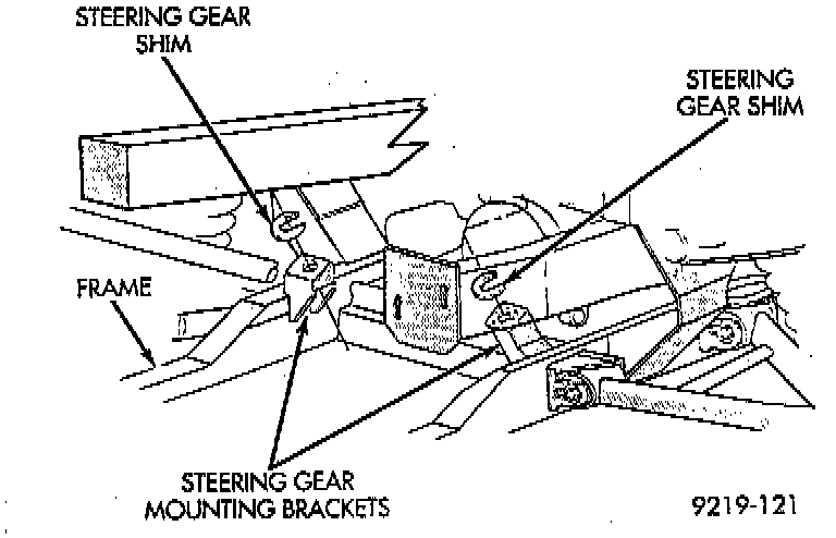 - Front wheel toe pattern is critical in controlling a vehicle's directional stability, as the vehicles suspension moves through normal jounce and rebound travel. Toe pattern adjustment is done by installing (0.5 1.0, 1.5, or 3.0 mm) shims between steering gear and steering gear mounting brackets. A maximum of 9.5 mm (0.375 inch) shimming is allowed between the steering gear and its mounting brackets. If steering gear is removed for any reason or a replacement steering gear is installed, the same thickness of shim MUST be reinstalled between steering gear and mounting brackets. This is necessary to maintain correct front wheel toe pattern of the vehicle, which is set during the vehicle's assembly alignment procedure.