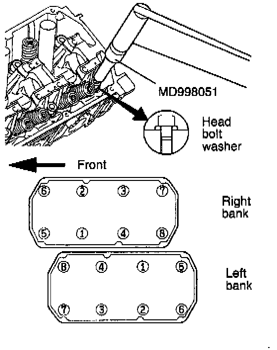 (1) Tighten the cylinder head bolts in the sequence shown. Each bolt should be tightened in two to three steps, torquing progressively. Tighten to the specified torque in the final sequence.