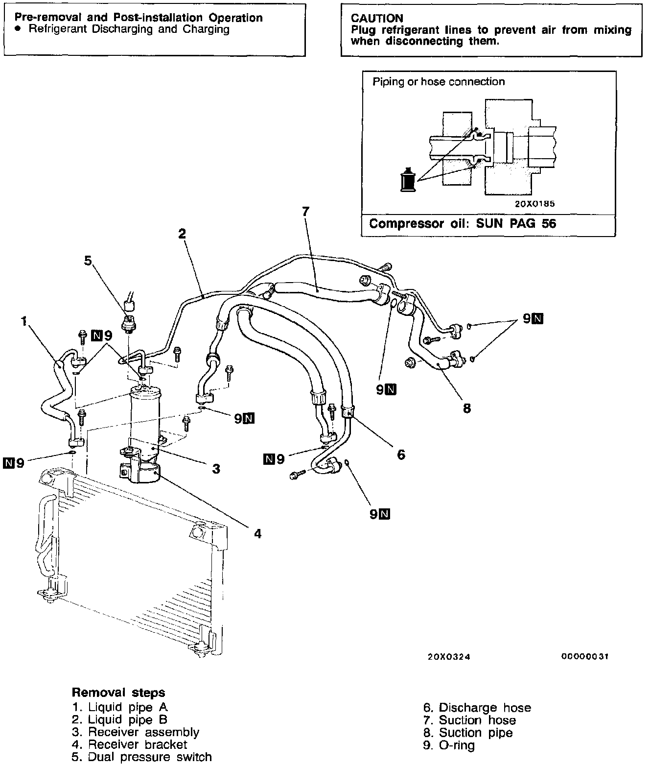 When replacing the suction hose or the receiver assembly, refill them with a specified amount of compressor oil.