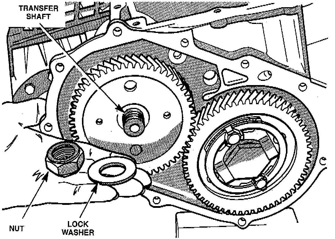 The 41TE transaxle uses a transfer system to transfer power from the output shaft of the rear carrier to the transfer shaft. The gear splined and bolted to the output shaft of the rear carrier is called the output shaft transfer gear. It supplies power to the transfer shaft transfer gear, which is splined to the transfer shaft and retained by a large nut. The bolt and nut that retain the transfer gears to each shaft must be tightened to the proper torque specification. Proper torque is essential for two reasons: to keep the gears on the shafts and to maintain the bearing settings.