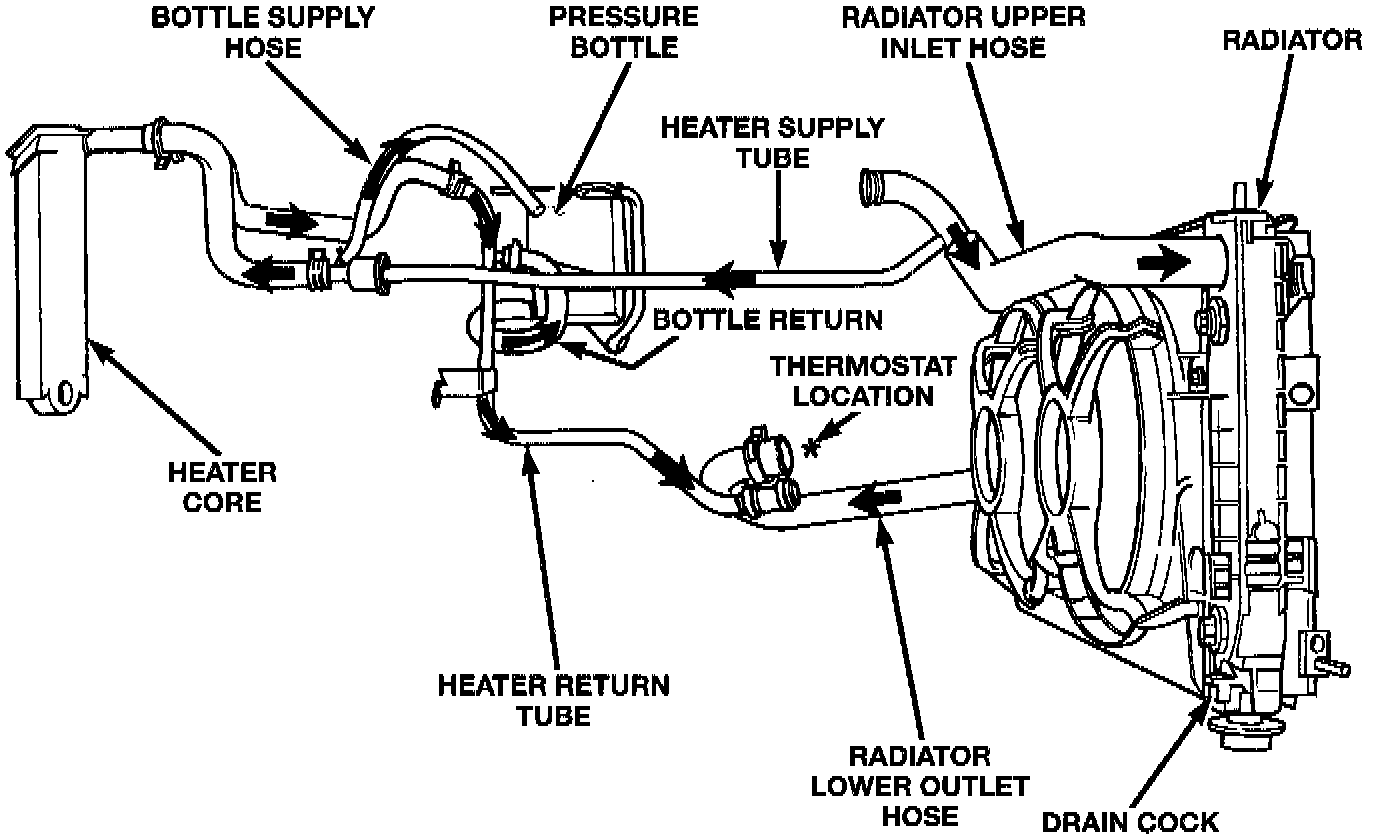 - When Engine is cold: Thermostat is closed, cooling system has no flow through the radiator. The coolant flows through the engine heater core, coolant bottle and an internal engine by-pass.