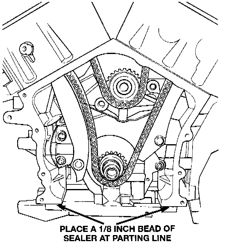 3. Before installing timing cover gasket apply a 1/8 inch bead of Mopar Silicone Rubber Adhesive Sealant to the parting lines between the oil pan and cylinder block.