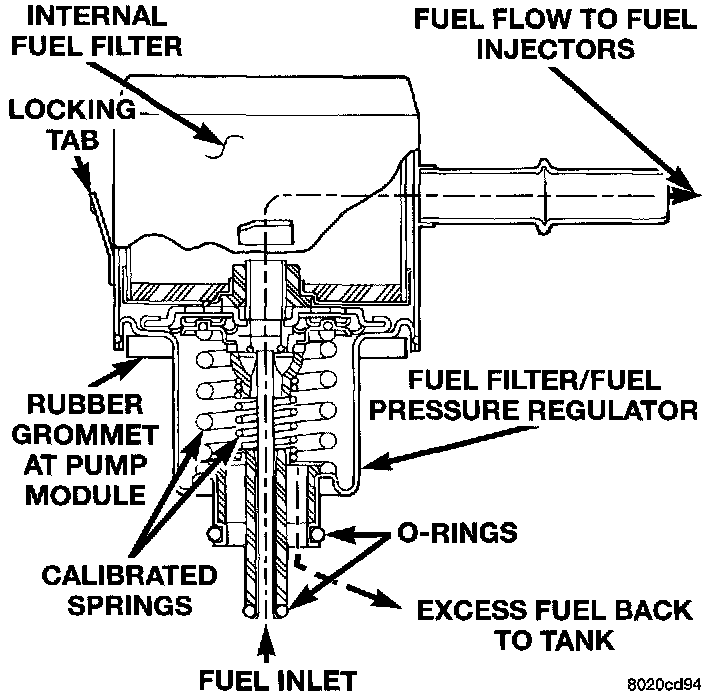 A combination fuel filter and fuel pressure regulator is used on all gas powered engines. It is located on the top of the fuel pump module. A separate frame mounted fuel filter is not used.