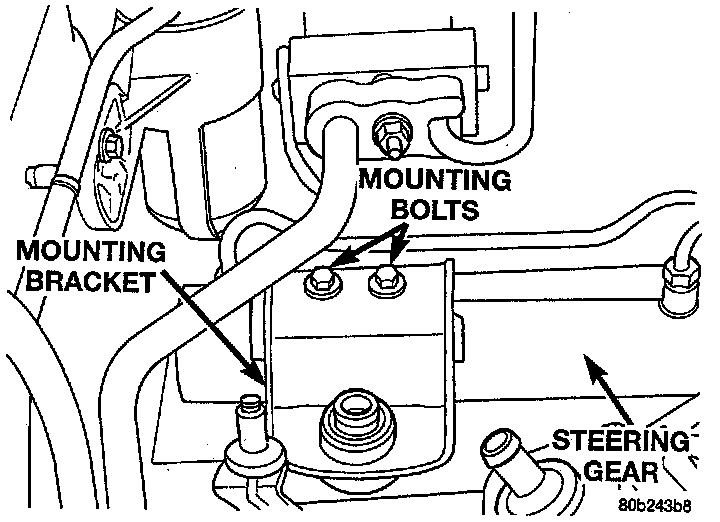 11. Install the bolts mounting the right side mounting bracket for the steering gear to the crossmember. Tighten the mounting bolts to a torque of 68 Nm (43 ft. lbs.).