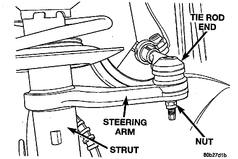 3. Install the outer tie rod on the steering arm of the right strut. Install the tie rod to steering arm attaching nut. Tighten the attaching nut to a torque of 37 Nm (27 ft. lbs.).