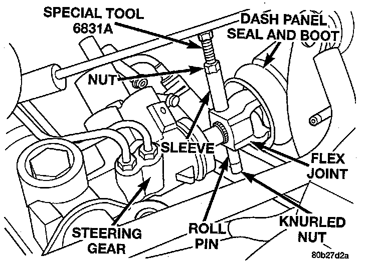 8. Using roll pin installer, Special Tool 6831A, or equivalent, install the roll pin in the flex joint of the intermediate shaft. Roll pin is installed in coupler using the following procedure. Remove knurled nut from small end of removal tool. Insert small end of removal tool through center of roll pin and then install and hand tighten knurled nut. Position sleeve of removal tool on flex joint as shown. Holding threaded shaft of tool from turning tighten nut pulling roll pin into flex joint. Roll pin must be equally spaced in flex joint.