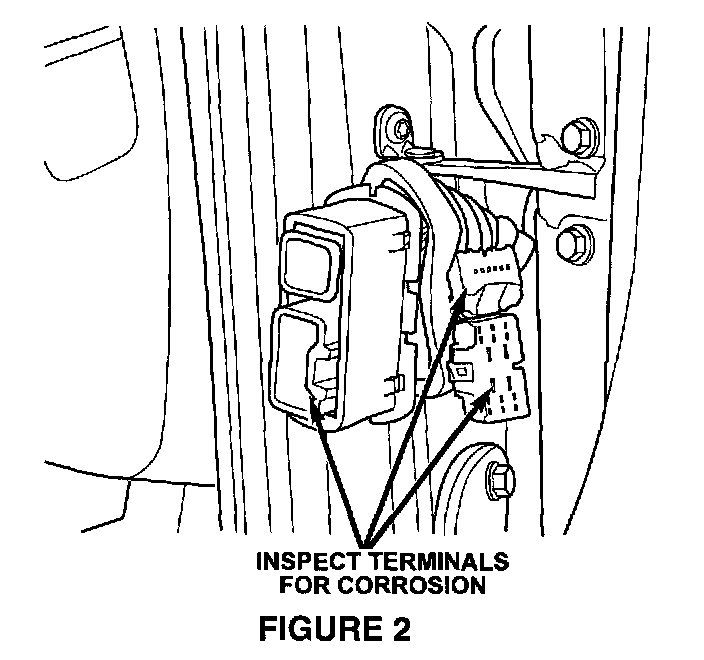 13. Inspect the terminals for any sign of corrosion or contamination. The white insulator may have a blue tint similar to the color of washer fluid (Figure 2). If corrosion is present proceed to step # 14. If no corrosion is present proceed to step # 19.