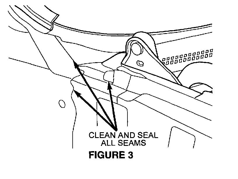 20. Inspect the A-pillar/cowl load beam body seams (Figure 3). Remove any excess/squeezed out, over expanded, body sealer material from the seams. Clean area with Mopar Super Clean, p/n 04886330AA, or equivalent.
