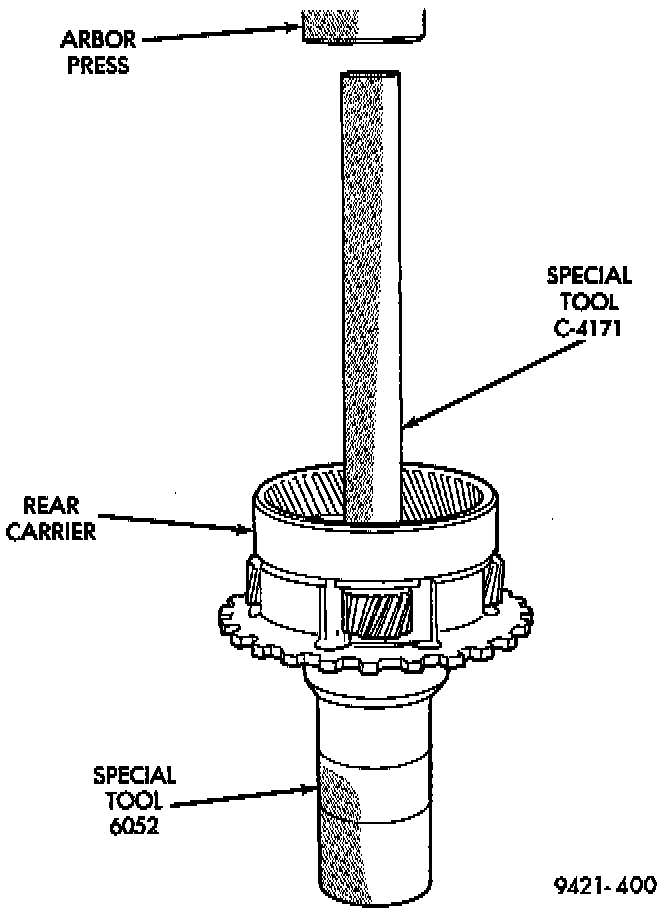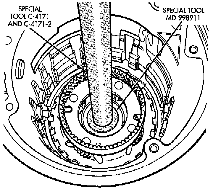 5. Install output shaft/rear carrier into rear bearing. The shaft must be pressed into position. Use special tool MD-998911 (Disc) and C-4171 and C4171-2 (Handle), or equivalents to press shaft into rear bearing.