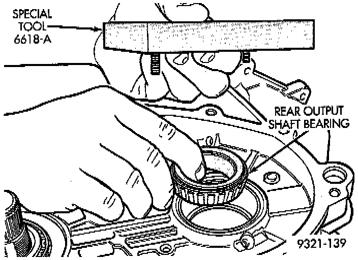 1. Install rear output shaft bearing cone and special tool 6618A, or equivalent.