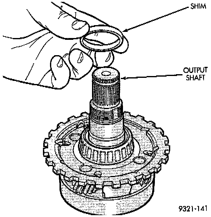 4. Install shim on output shaft. Apply small amount of petrolatum onto the shim to hold it in place. Use the original shim as a starting point. If original shim is not available, use the thickest shim available. Refer to Output Shaft Rear Shim Chart for available sizes.