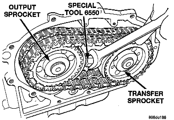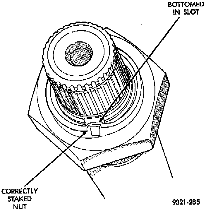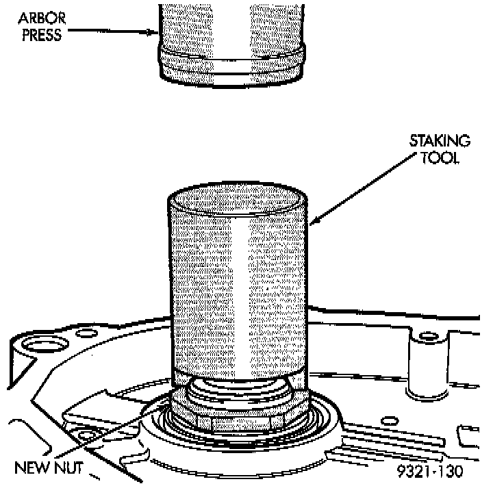 8. The new nut must be staked after the correct turning torque is obtained. Use special tool 6639, or equivalent to stake output shaft nut and special tool 6589, or equivalent to stake transfer shaft.