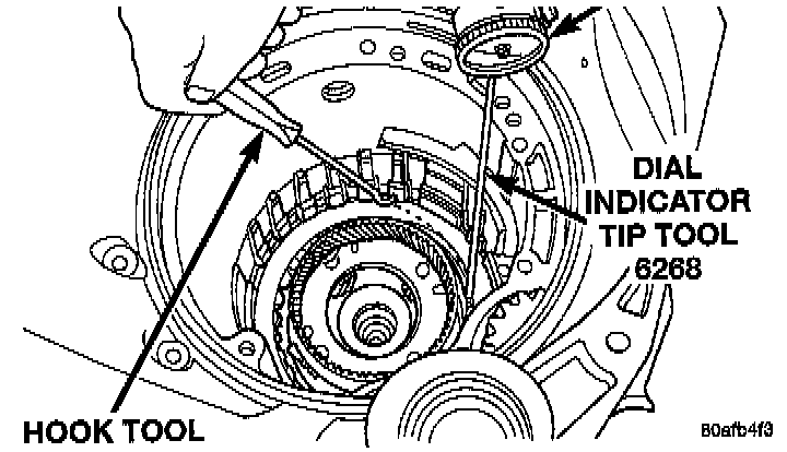 Press down clutch pack with finger and zero dial indicator. Low/Reverse clutch pack clearance is 0.89 to 1.47 (0.035 to 0.058 inch).
