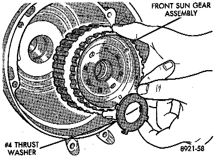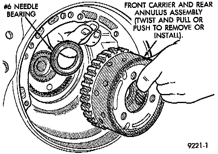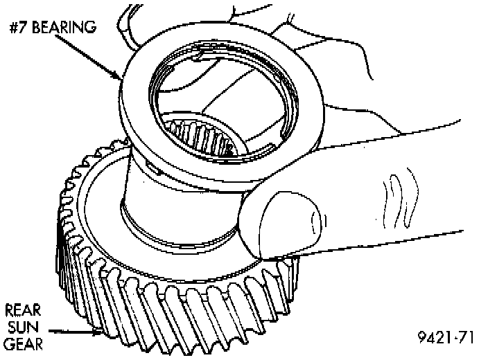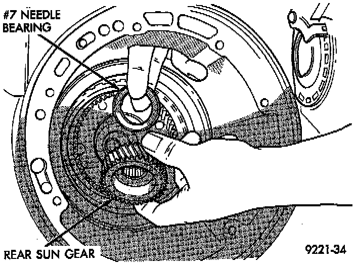 The number 7 needle bearing has antireversal tabs and is common with the number 5 and number 2 position. The orientation should allow the bearing to seat flat against the rear sun gear. A small amount of petrolatum can be used to hold the bearing to the rear sun gear.