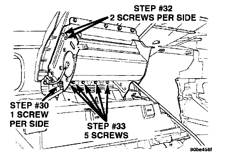 33. Remove five screws from the passenger airbag module assembly to retainer (20 in. lbs. torque).