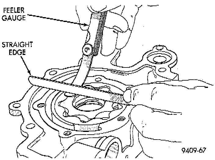 7. Place a straightedge across the face of the pump housing, between bolt holes. If a feeler gauge of 0.102 mm (0.004 inch) or more can be inserted between rotors and the straightedge, replace pump assembly. ONLY if rotors are in specs.