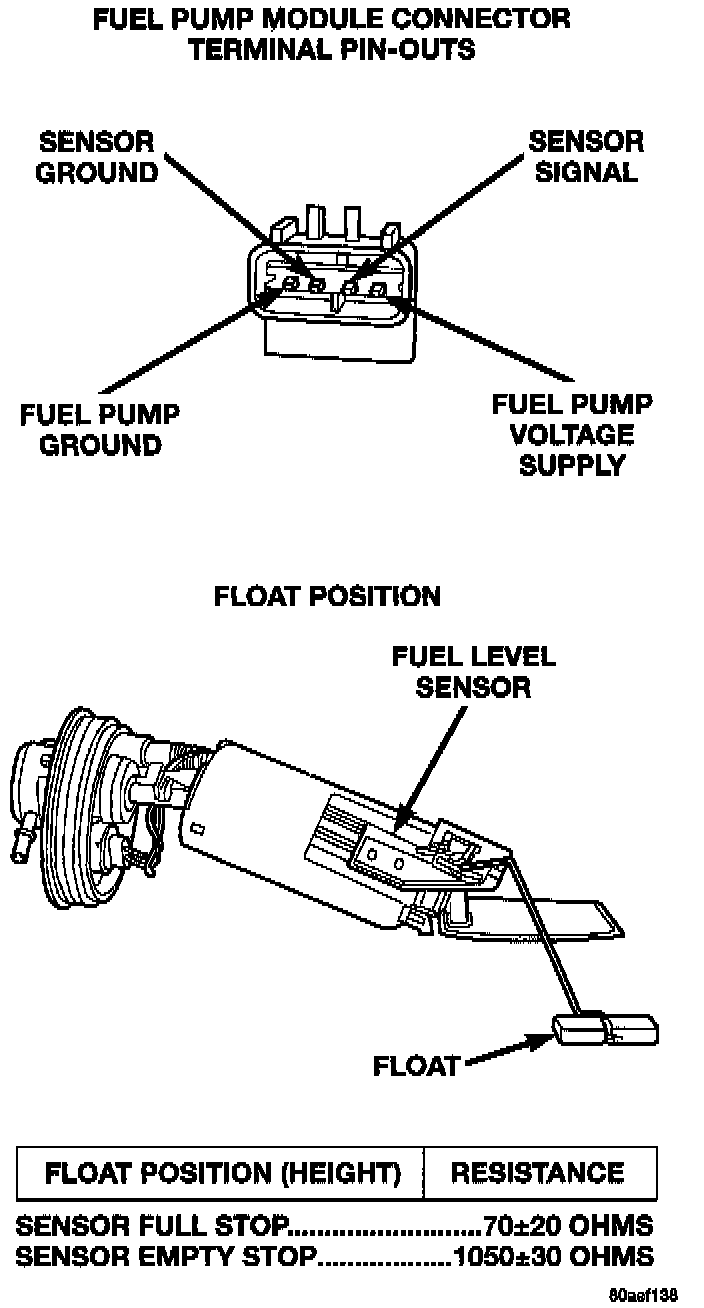 The float arm attached to the sensor moves as the fuel level changes. To test the level sensor, connect an ohmmeter across the sensor signal and sensor ground terminals of the fuel pump module connector. Move the float lever to the positions shown in the resistance chart. Record the resistance at each point. Replace the level sensor if the resistance is not within specifications.