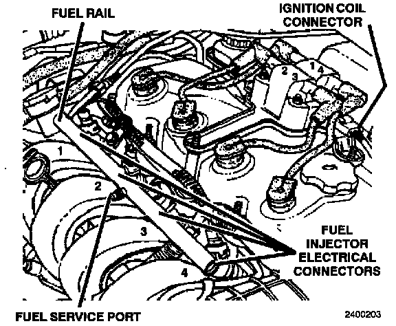 Fuel Rail, Ignition Coil Connector, Fuel Service Port, Fuel Injector Electrical Connector: