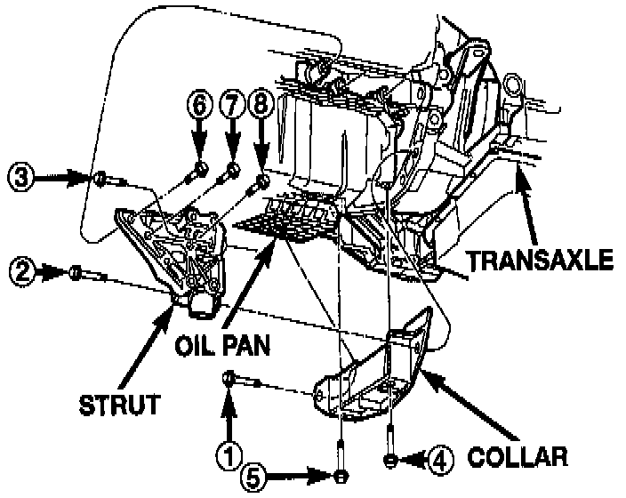 3. Remove bolts attaching collar and bending strut to engine, oil pan, and transaxle. Remove strut and collar.
