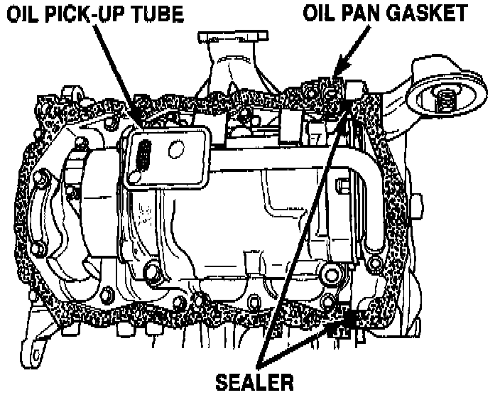 1. Apply Mopar Silicone Rubber Adhesive Sealant or equivalent at the oil pump to engine block parting line.